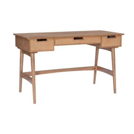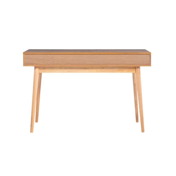 The ash veneer frame adds a warm, textured look, while the round wooden legs provide solid support and a touch of mid-century charm. With two built-in drawers, you’ll have plenty of space to tuck away pens, notebooks, and other office essentials. The open central shelf offers easy access to frequently used items or can serve as display space for decorative accessories.
