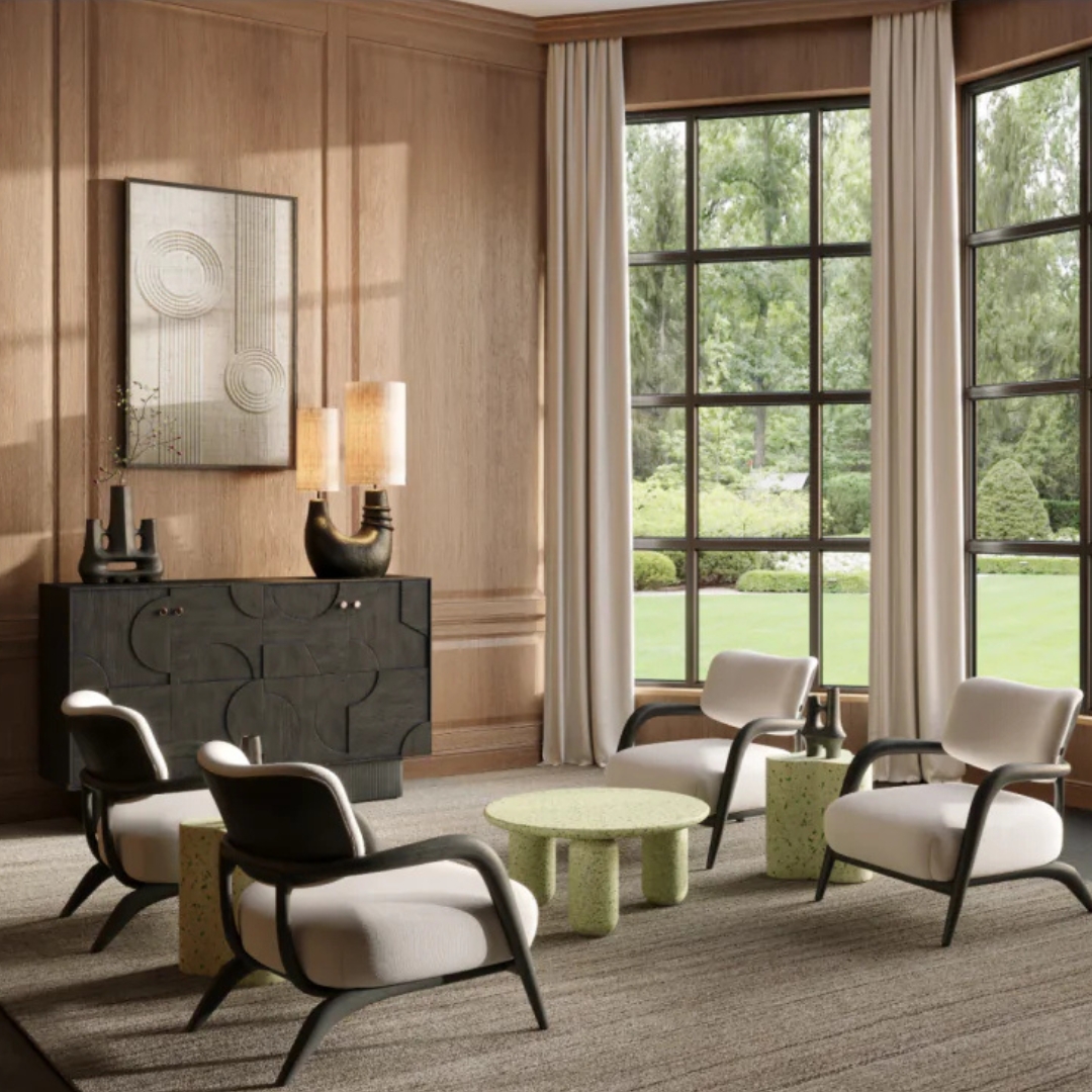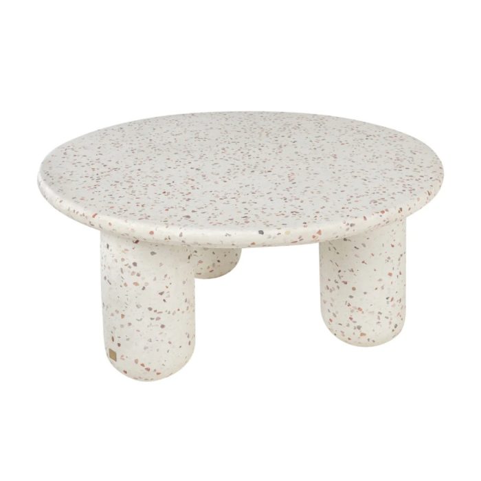 The table’s round top, crafted from high-quality green terrazzo, offers a vibrant, refreshing look that instantly brightens any room. Each tabletop is handmade, giving it a one-of-a-kind appearance with natural terrazzo variations that ensure no two tables are exactly alike. The polished surface is easy to maintain and offers plenty of space for decor, books, or serving trays.
