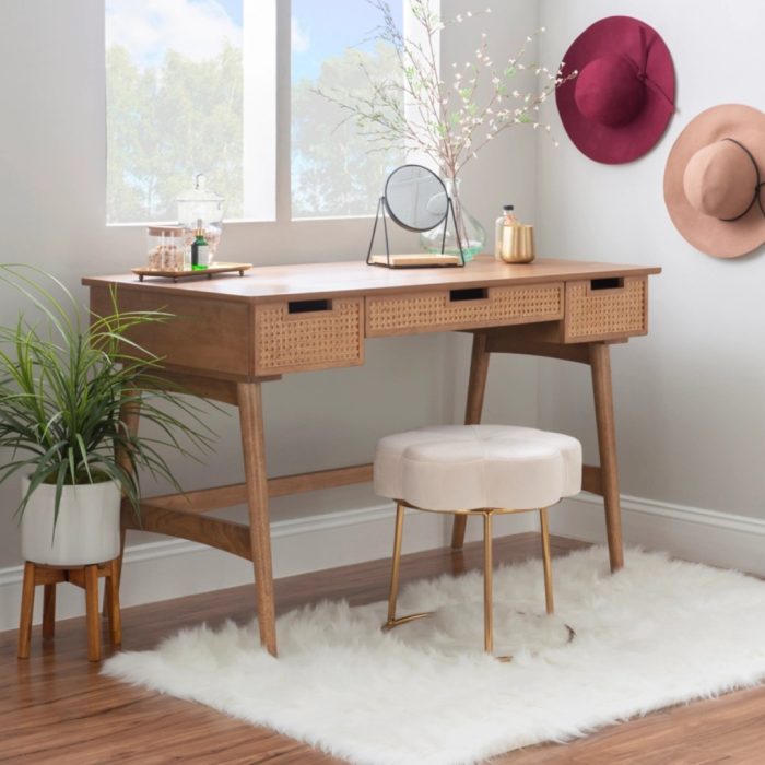 SKU: EF00009 Category: Office Desk Tags: birch veneer furniture, home study furniture, mid-century modern desk, rattan desk, solid wood home office, stylish workspace, woven drawer desk